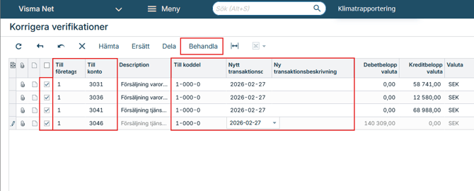Kontrollera noggrant vilka rader och verifikationer som kommer att ändras. Klicka på Behandla för att slutföra korrigeringen.