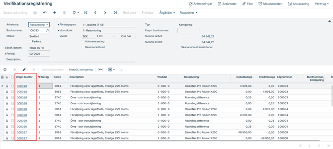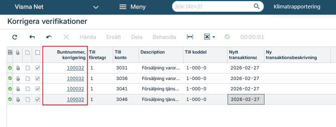 Klicka på Buntnummer, korrigering för att se den korrigerade verifikationen.