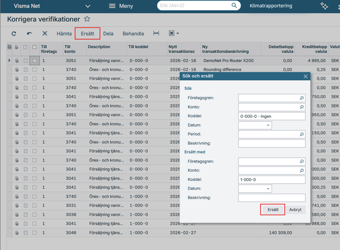 - ändra konto, koddel, transaktionsdatum eller transaktionsbeskrivning på en bokförd verifikation